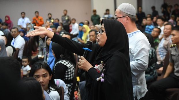 Keluarga korban jatuhnya pesawat Lion Air JT 610 menyampaikan pertanyaan saat konferensi pers. (ANTARA FOTO/Akbar Nugroho Gumay) |