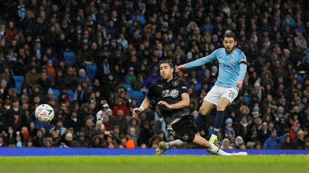 Bernardo Silva melepaskan tembakan yang menghasilkan gol kedua Manchester City. (REUTERS/Phil Noble) |