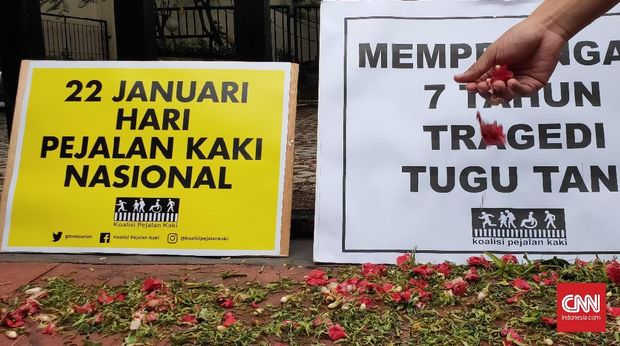 Koalisi Pejalan Kaki melakukan tabur bunga sekaligus menyuarakan keprihatinan soal keselamatan pejalan kaki. (CNNIndonesia/Safir Makki) |