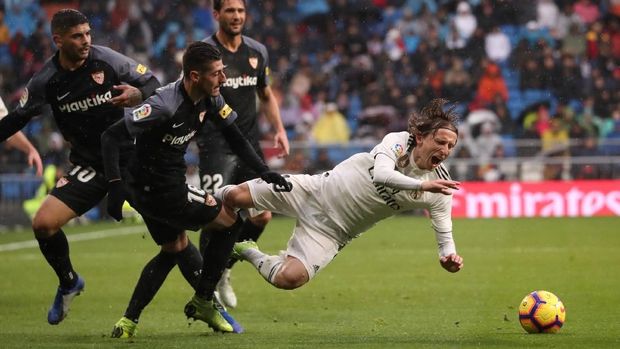 Los Blancos sempat kesulitan menembus pertahanan tim tamu Sevilla pada babak pertama. Mereka nyaris mencetak gol pada menit keenam dari aksi Luka Modric mencuri bola kemudian meneruskannya ke Vinicius Jr.