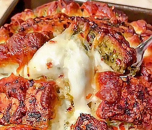 The soft, buttery inside with the crunchy, cheesy outside is a well-balanced combination. The garlicky pesto adds an extra layer of flavor, while the crushed red pepper brings the right amount of heat.