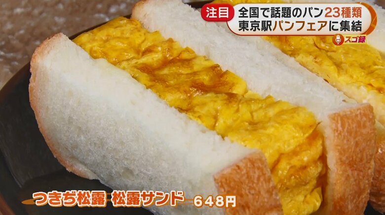 さらに、人気卵焼き専門店の大きな卵焼きが挟まったサンドイッチ(つきぢ松露「松露サンド」648円)まで、全国各地のいま話題のパンが勢揃いしている。