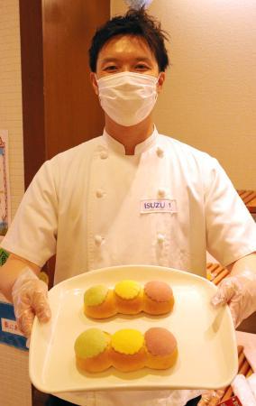 「守ろう!信号パン」を持つイスズベーカリーの井筒大輔代表取締役=神戸市中央区北長狭通2、イスズベーカリー生田ロード店